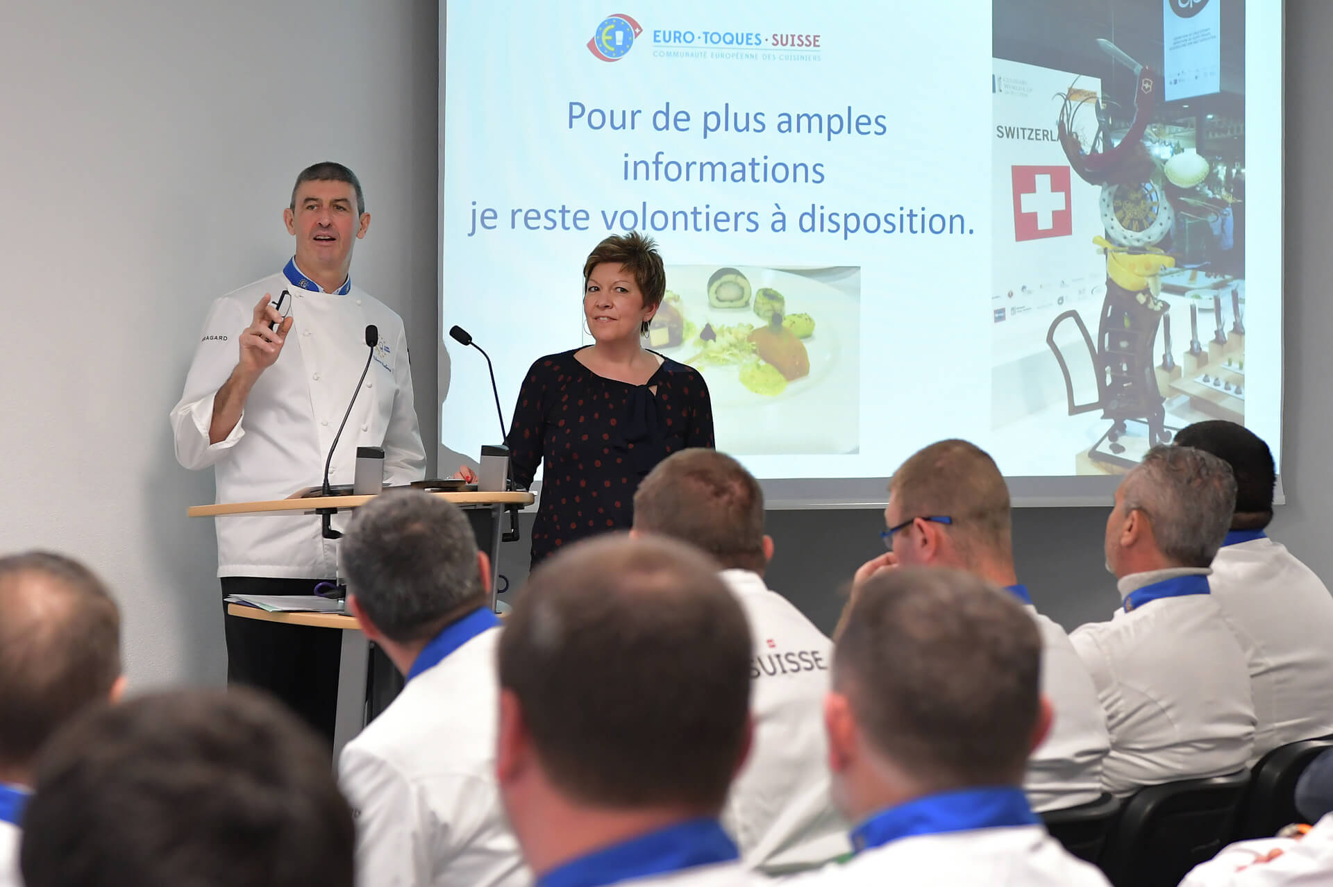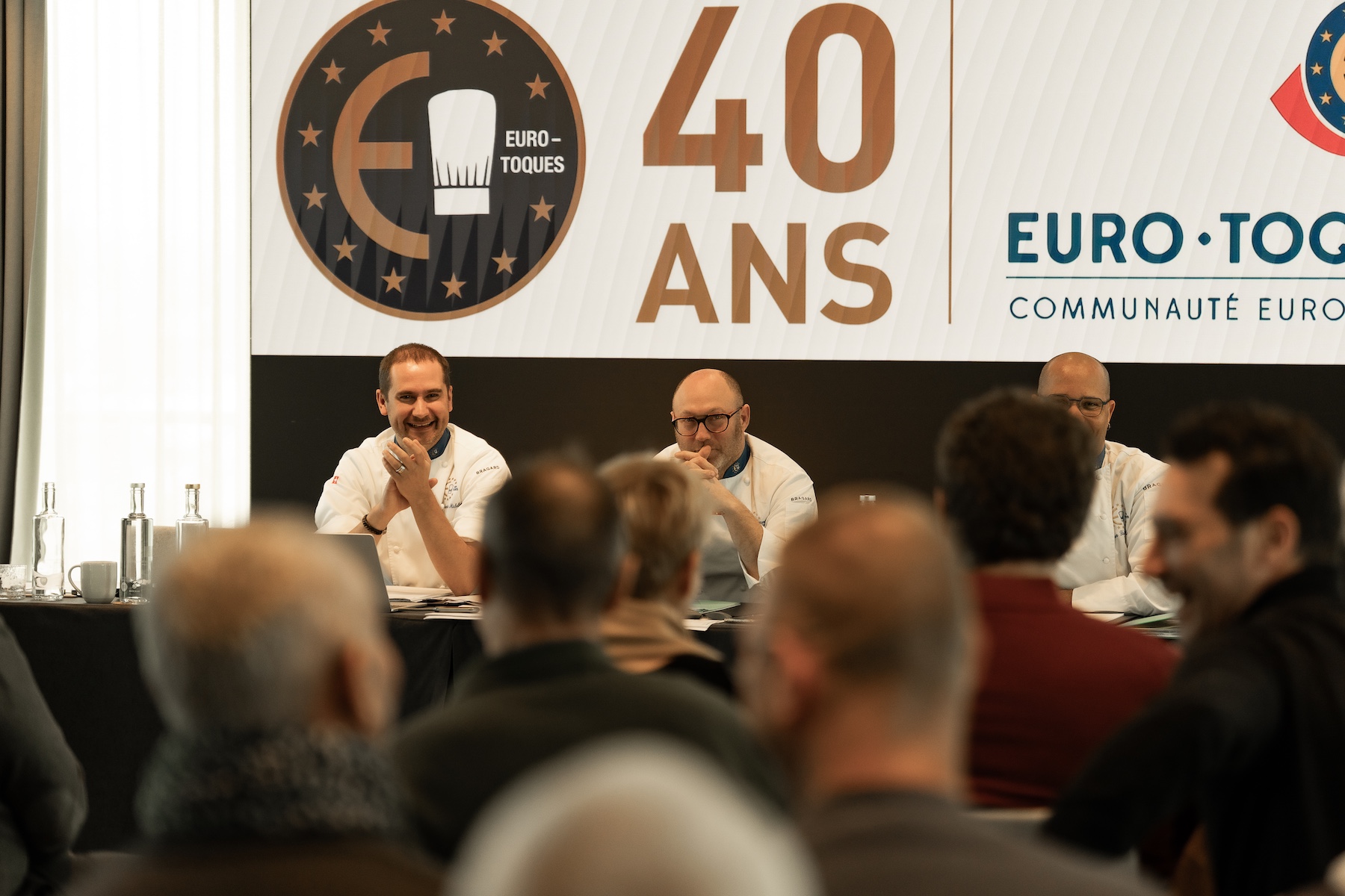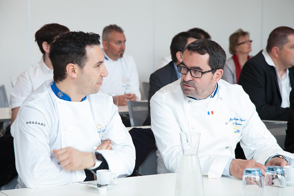 Les chefs Guillaume Gomez du palais de l'Elysée, Michel Roth de l'Hôtel Ritz à Paris et de l'hôtel Président Wilson à Genève, membres du « Comité des sages » nouvellement élu, ont fait une intervention pour rappeler le caractère spécifique de notre association qui est la défense des produits du terroir à Bruxelles.