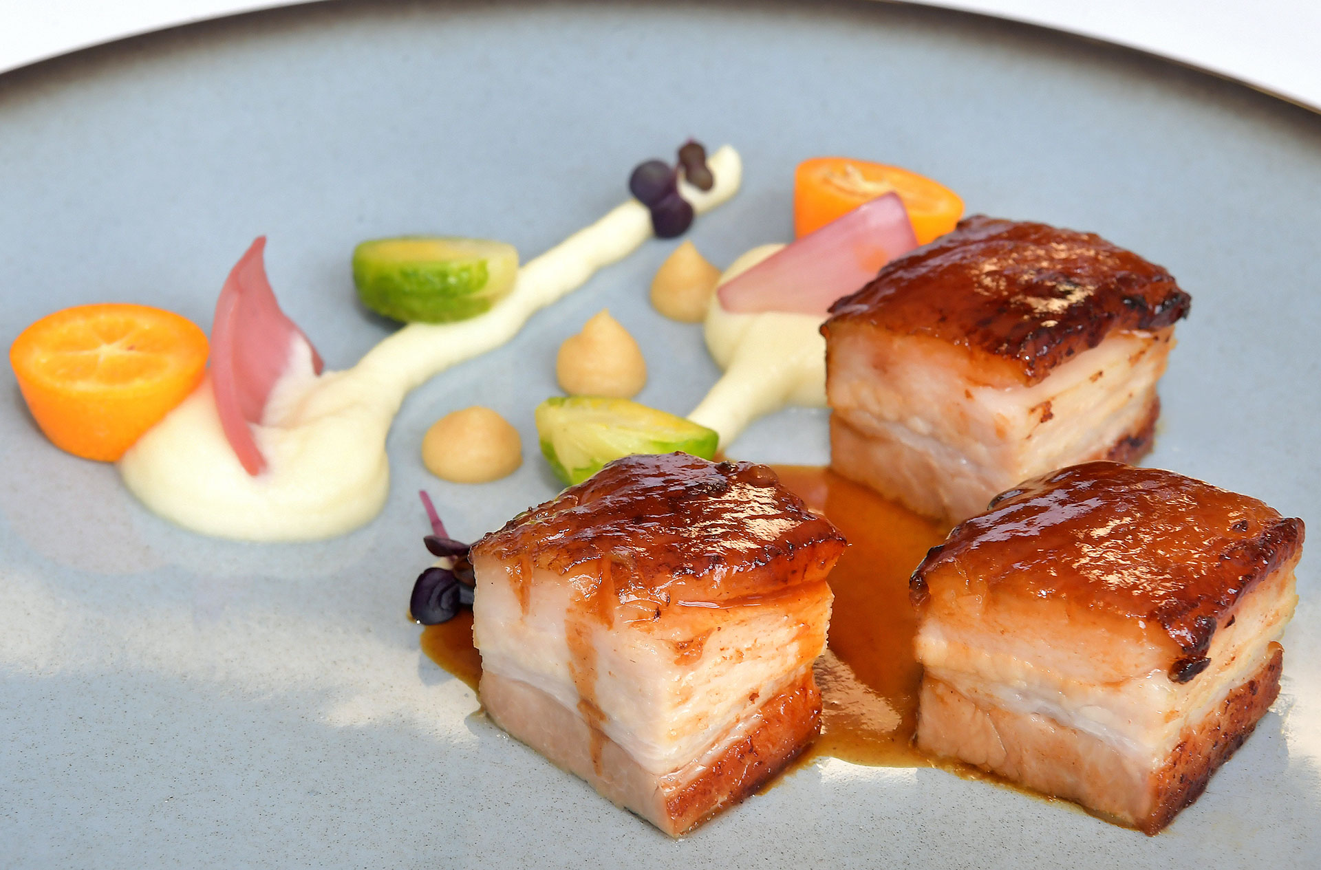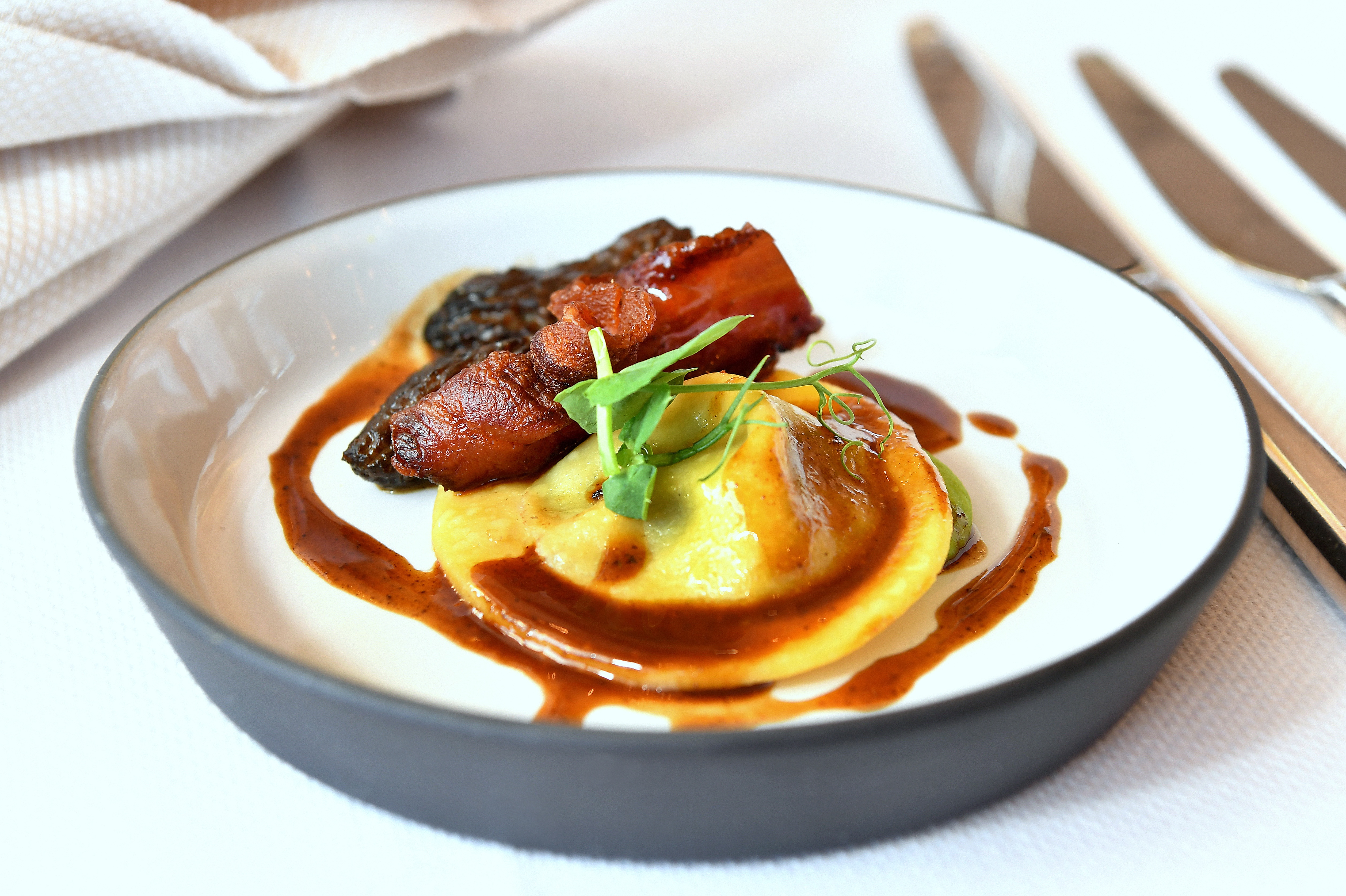 Dresser des fines tranches de boudin séché légèrement chauffé sur une purée de panais. Accompagner le plat de petits panais rôtis & napper avec une sauce aux grains de café et poudre d'acacia.