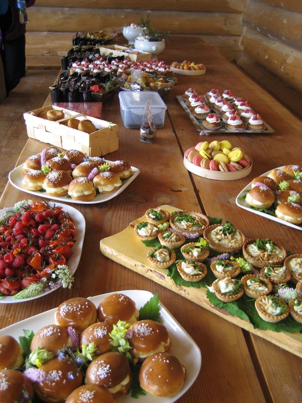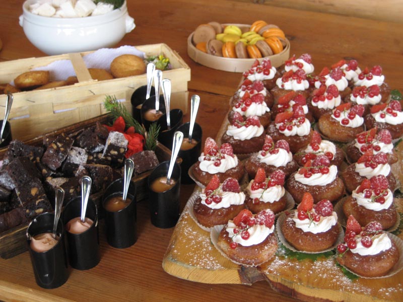 A la Cabane du Scex, qui surplombe Villars avec une belle vue, nos amis Jean-Louis, avec une partie de l’équipe de cuisine, un somptueux buffet sur la base des plantes que nous venions de découvrir, Bernard Cavé d’Ollon (www.bernardcavevins.ch) avec ses merveilles et la famille Dietrich, directeur de l’Eurotel Victoria, qui nous mets généreusement « à disposition ses cuisiniers », nous attendait sous un beau soleil. Nous avons pu déguster des Pomme d’amour au mélilot, des Bricelets au cumin des prés et mousse de séré fumé, du Jambons de magrets aux bourgeons de sapin et en dessert des Tropézienne à l’aspérule odorante, des Guimauve au miel de bourgeons de sapin et un cake à l’avocat et berce ainsi qu’un assortiment de macarons, (citron-serpolet, menthe sauvage-chocolat, coquelicot, caramel-reine des prés…) et beaucoup d’autres bonnes choses.