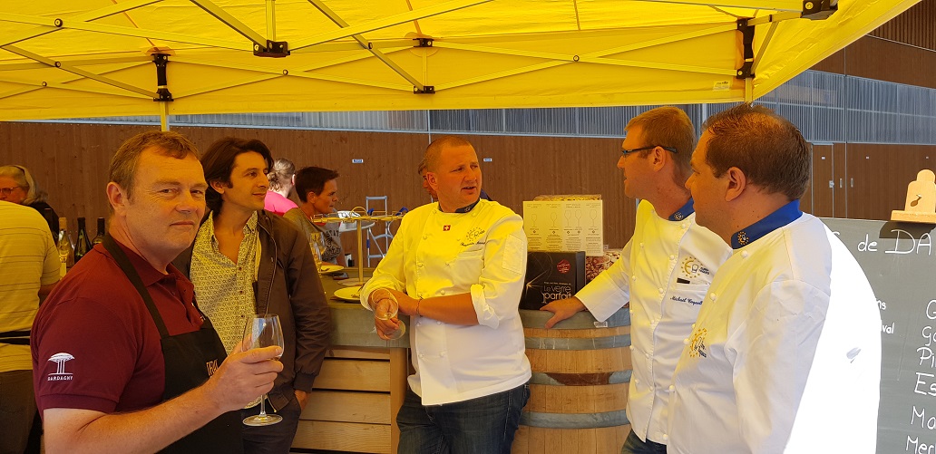 Ce fût au tour de Jean-Marie Bourget, chef au restaurant du golf de Voëns à St-Blaise de nous accueillir pour le déjeuner autour des produits de nos artisans du jour. Les vins de Jean Daniel Giauque, vigneron à La Neuveville ont mis nos papilles en éveil, l'accord « Gentil Rhin » avec les fromages de la maison du fromage à Neuchâtel, représentée par Cédric Naudin, fût une merveille. Le repas ne pouvait que se terminer par du chocolat et c'est Julien Badet de Jacot Chocolatier qui apporta cette note de douceurs.